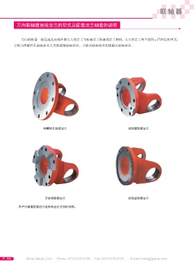 联 轴 器 万向联轴器连接法兰的型式及配套法兰轴套的说明 万向联轴器一般是通过两端外侧叉头的法兰与配套法兰轴套的法兰相联。叉头的法兰有下图所示四种结构型式, 分别为纯螺栓孔联接法兰以及端面键联接法兰、牙嵌式联接法兰和端面齿联接法兰。 纯螺栓孔联接法兰 端面键联接法兰 牙嵌式联接法兰 端面齿联接法兰 用户可根据需要进行选择并应在订货时说明。 E - 024 Www.Gelufu.Com Phone: 0312-678 4766 Fax: 0312-678 4733 E-mail:china@gelufu.com